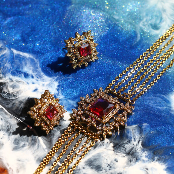 This majestic bridal choker set is crafted to embody royal grace and timeless sophistication. Designed to sit elegantly along the neckline, it enhances the bride’s beauty with a rich, regal presence. Every detail reflects heritage-inspired artistry, making this piece a true symbol of luxury and tradition.