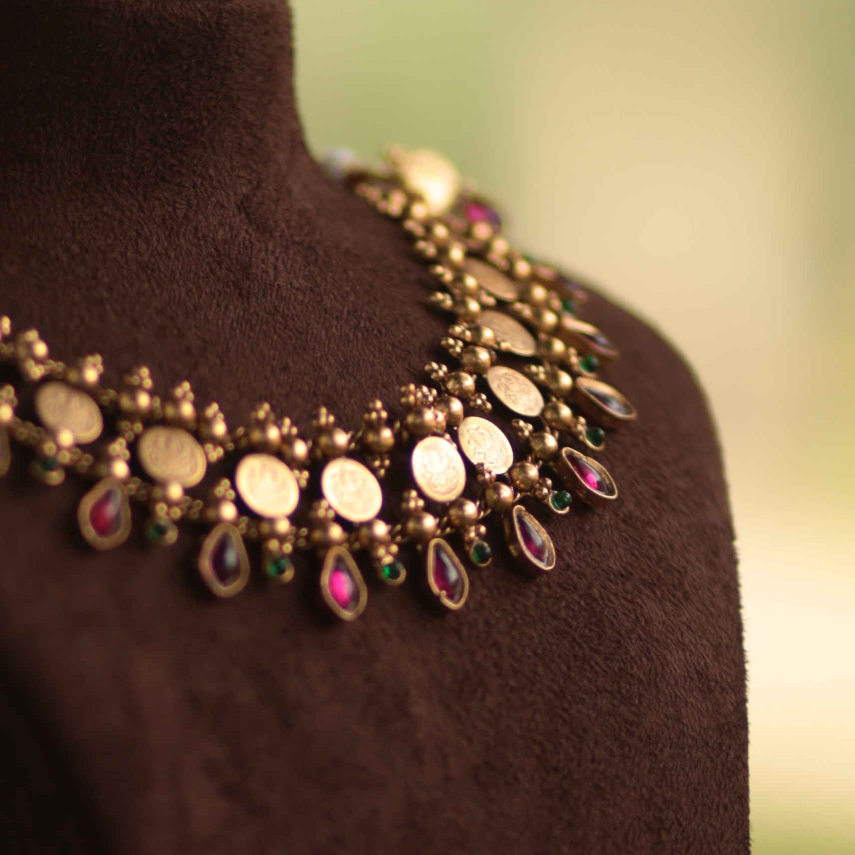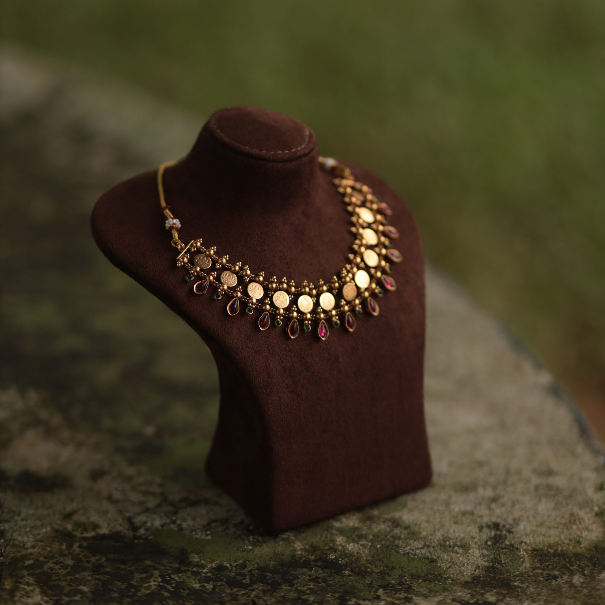 Design: Authentic South Indian Coin (Kaashu) Pattern featuring embossed traditional motifs and ruby embellishments.