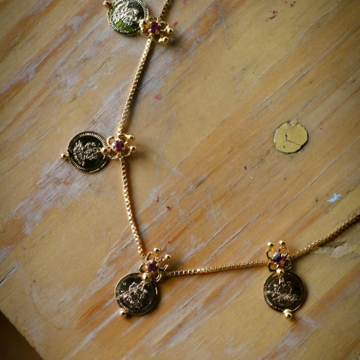 Each intricately detailed gold-toned coin (Kaashu) is embossed with traditional motifs signifying prosperity and abundance, then punctuated with vibrant ruby accents for a touch of royal brilliance. The necklace is expertly contoured to sit flush against the neckline, creating a rhythmic, golden silhouette that commands attention while honoring the elegance of Vedic artistry. Designed for the modern woman with a heart for history, this heirloom-quality piece is a timeless investment in style.