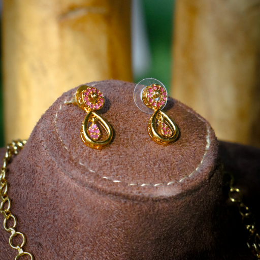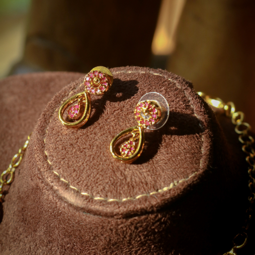 Crafted with a high-polish gold finish, each link and the central dewdrop pendant are intricately set with vibrant ruby-pink stones. The necklace is designed to drape perfectly, creating a graceful silhouette that transitions effortlessly from festive celebrations to elegant evening wear. Accompanied by matching teardrop earrings, this set serves as a beautiful reminder of feminine strength and modern grace.